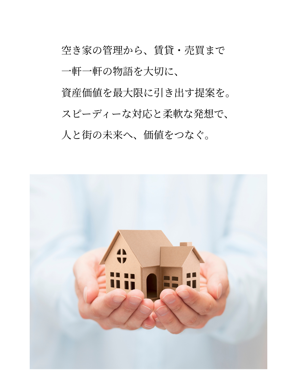 リノベーション、空き家管理、資産活用のご提案も。小さなご相談にも即日対応し、心を込めて向き合います。